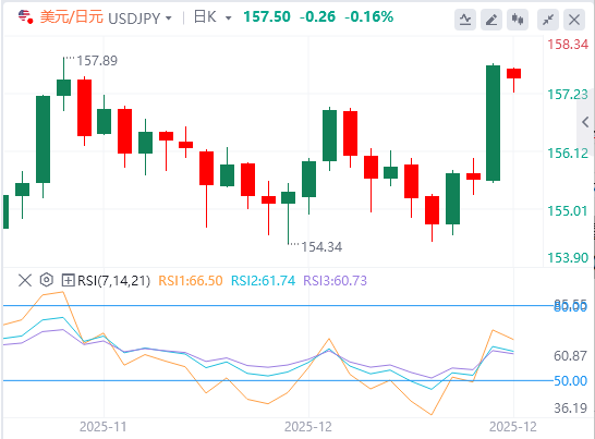 美元兑日元在周五上涨近1.5%后调整下跌,且交易区间跌破157.50。
