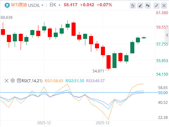 周三亚盘,原油交投58.41附近。在持续的地缘政治紧张局势下,例如美国对委内瑞拉油轮的行动,WTI价格持续上涨。
