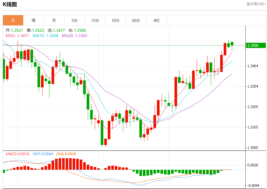 英镑/美元:截止北京时间21:20,英镑/美元上涨,现报1.3506,涨幅0.05%。纽市盘前,日线级别处于上涨后的震荡消化期,5日、10日均线多头排列未破,价格在1.3400—1.3550区间博弈,为趋势延续的中段整理,非转弱信号。