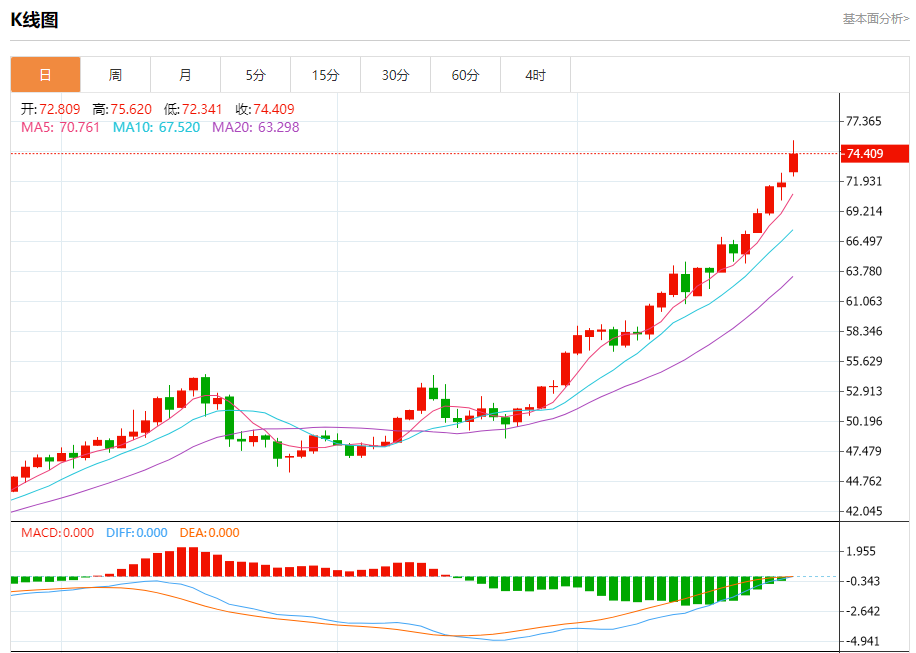 现货白银:截止北京时间21:20,现货白银上涨,现报74.483,涨幅3.74%。纽市盘前,日线级别多头趋势完好,5日、10日均线呈多头排列,价格在72.00—75.60区间博弈,为趋势延续的中段整理,非转弱信号。