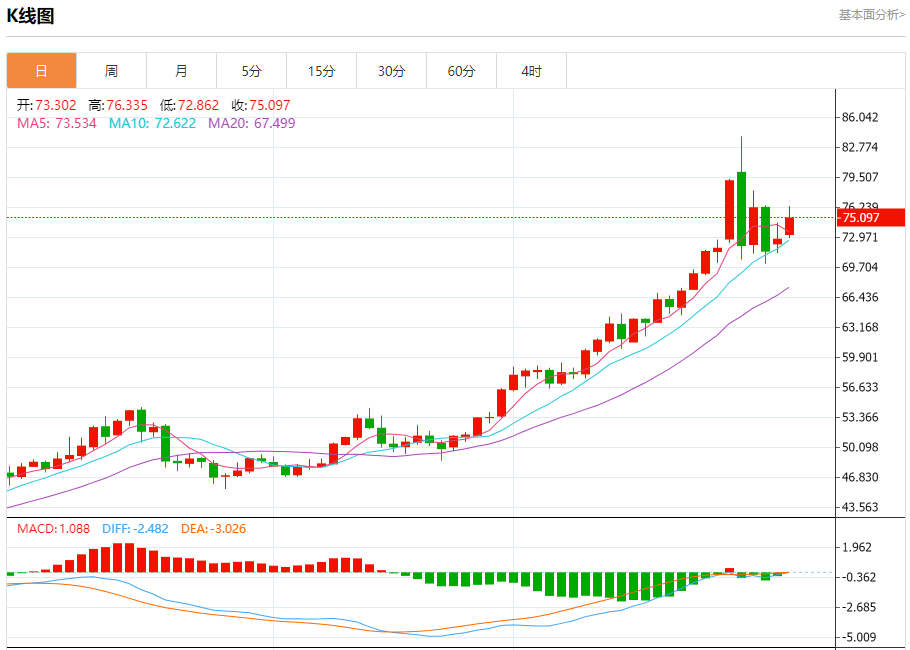 现货白银:截止北京时间21:20,现货白银上涨,现报75.064,涨幅3.15%。纽市盘前,(白银)价格在盘中水平的最后一次交易中略有下降,其交易高于EMA50所代表的动态压力持续存在,加强了短期主要看涨趋势的稳定性和主导地位,特别是其沿着趋势线交易,试图快速获利,并收集可能有助于其再次上涨的看涨动力,此外,其试图卸载一些明显的超买条件,特别是随着负面重叠信号的出现。