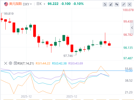 周一,美元指数先涨后跌,盘中刷新去年12月10日以来高位,但美盘时段持续下行,截至目前,美元报价98.22.