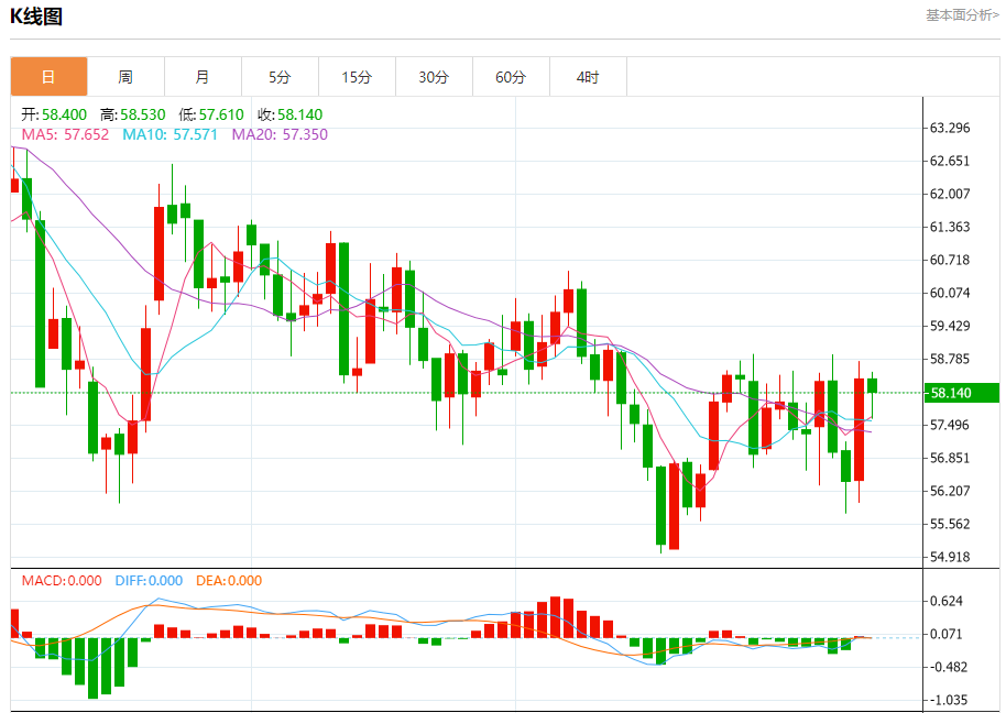 原油市场:截止北京时间21:20,美油上涨,现报58.180,涨幅0.73%。纽市盘前,(原油)价格在最后一个交易日的水平上波动,因为它试图在相对强势指标上摆脱一些明显的超买状况,特别是在那里出现负面信号的情况下,以收集可能有助于它在短期基础上恢复和恢复强劲涨势的看涨势头,利用其在EMA50上方交易所代表的动态支持,加强复苏的机会。