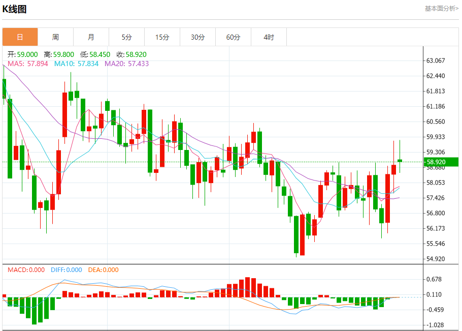 原油市场:截止北京时间21:20,美油下跌,现报58.920,跌幅0.34%。纽市盘前,(原油)价格在最后一个交易日下跌,受相对强度指标出现负面信号的影响,在达到超买水平后,试图摆脱这些超买状况,试图获得新的看涨动力,可能支持其复苏,并在即将到来的时期恢复上涨。