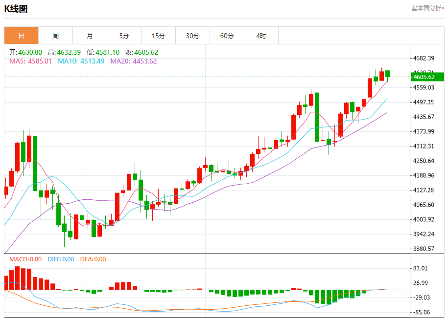 现货黄金:截止北京时间21:20,现货黄金下跌,现报4605.05,跌幅0.44%。纽市盘前,在卸载相对强度指标的超买条件后,黄金价格在最后一个交易日上涨,其动态支撑继续表现为交易高于EMA50,并在短期主要看涨趋势的主导下,其交易与该趋势的支撑趋势线并行。
