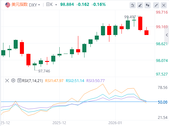 周一,特朗普威胁对欧洲加征关税,令投资者转向瑞郎等避险货币,美元指数日内承压,截至目前,美元报价98.88。