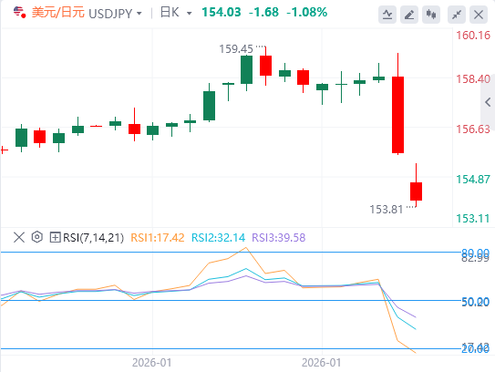 日本干预的迹象使日元走强,美元兑日元进一步回落至接近154.00,接近近154.00,高点为近两周前的一年半高点159.45。