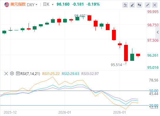 1月29日,北京时间周四亚市早盘,美元指数徘徊在96.16附近。周三,因美联储维持利率不变,美元指数日内持续反弹,重回96上方,最终收涨0.61%,报96.34;基准的10年期美债收益率收报4.246%,对美联储政策利率敏感的2年期美债收益率收报3.578%。现货黄金本月以来的迅猛涨势毫无放缓迹象,周三首次突破5400美元/盎司,日内暴涨220美元,创单日涨幅之最,最终收涨4.6%,报5417.44美元/盎司;现货白银随黄金上行,最终收涨3.97%,报116.77美元/盎司。因对伊朗局势的担忧升温,油价周三升至去年9月底以来最高。WTI原油震荡上行,重回63美元上方,最终收涨1.47%,报63.57美元/桶;布伦特原油收涨1.33%,报67.42美元/桶。