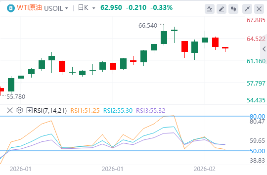 技术面:美原油当前主趋势为上行。价格在前期触及54.98美元低点后展开反弹,目前仍处于上升结构中。若价格向上突破66.48-66.60美元压力区间(前期高点密集区),将重新确认强势上行趋势;若向下跌破58.52美元支撑位,则主趋势将转为下行。自1月7日55.65美元低点形成的上升趋势线,支撑位正以每日0.36美元的速度上浮,当前动态支撑位在62.85美元。这一趋势线是短期多头的重要防守位,若有效失守,可能触发加速回调。