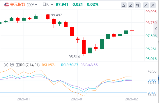 2月6日,北京时间周五亚市早盘,美元指数徘徊在97.93附近。周四,美元指数持续站稳脚跟,盘中一度逼近98关口,创近两周新高,最终收涨0.34%,报97.96;基准的10年期美债收益率收报4.182%,对美联储政策利率敏感的2年期美债收益率收报3.455%。贵金属遭重挫,现货黄金开盘后急速下跌,并一度失守4800美元,随后又反弹超100美元,但在美盘时段金价继续震荡下跌,再度跌破4800大关,最终收跌3.73%,报4779.41美元/盎司;现货白银在亚盘时段一度重挫10美元,随后陷入震荡,但在美盘时段继续扩大跌幅,并跌至70美元关口附近,最终收跌19.68%,报70.79美元/盎司。因美国与伊朗同意周五在阿曼举行会谈,缓解了市场对伊朗原油供应的担忧,原油跌超2%。WTI原油震荡下行,盘中一度跌至62.70美元的日内低点,最终收跌2.14%,报63.16美元/桶;布伦特原油收跌2.09%,报67.04美元/桶。