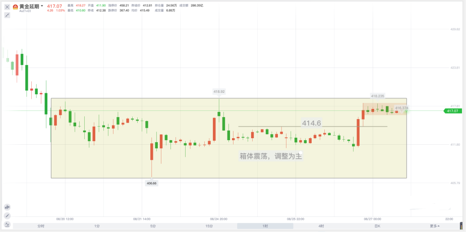 参考国际黄金走势,近期黄金TD价格趋于整理,上方压力位关注418元附近,下方支撑位关注406元附近,金价维持箱体震荡。短期价格上,此前金价在突破前高414.6后,经回踩确认进一步上涨,目前白盘黄金TD在416.3-418.2区间窄幅震荡,市场偏向观望。