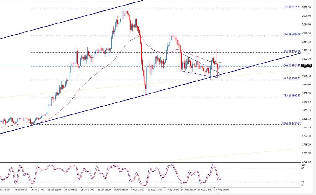 周五(8月28日)亚市盘中,现货黄金维持反弹走势,金价现报1942美元/盎司附近。