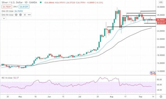 由于美元承压,银价继续在27美元附近交易,试图在26.75美元/盎司的20日简单平均线下方交投。如果美元指数继续反弹,白银可能会跌至20日简单平均线以下,并获得更多下行动能。