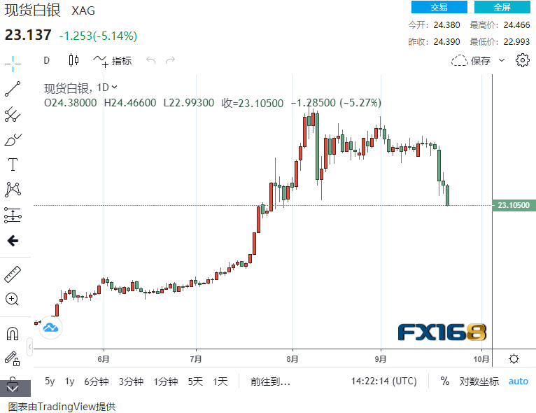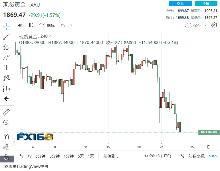 周三(9月23日)美市早盘,现货黄金、白银跌势再度加剧:金价跌破1870,最低触及1867.27美元/盎司,日内最多暴跌超38美元;现货白银狂泄不止不住,最低触及22.993美元/盎司,跌超5%。