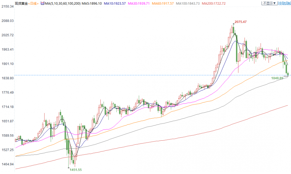 周四(9月24日)现货黄金跌破1850大关,创7月22日以来的两个月新低,日内美元指数进一步走高,创两个月新高至94.5593,避险独青睐美元,全球股市继续承压,黄金避险需求全无。