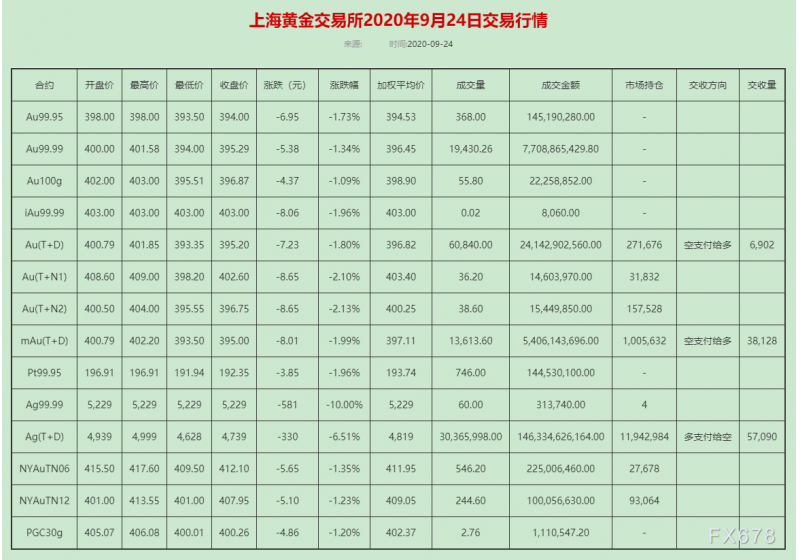 ① 黄金T+D收盘下跌1.80%至395.2元/克,成交量60.84吨,成交金额241亿4290万2560元,交收方向“空支付给多”,交收量6.902吨;