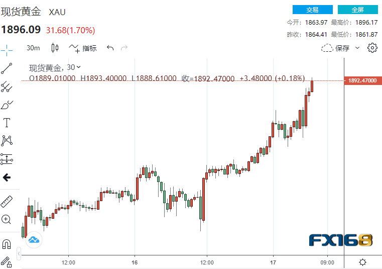 现货黄金站上1890美元/盎司,最高触及1896.17美元/盎司,日内大涨1.7%。COMEX期金站上1900美元/盎司,涨幅2.19%。