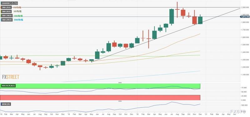 在月度图表上,从2019年5月开始,价格似乎已经恢复到上升趋势线以上,证实了看涨的前景。如果金价继续沿着这条线走下去,预计2021年年中左右将突破2000美元。