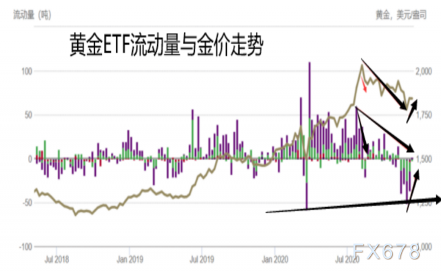 第四阶段:8月初开启的回撤阶段,由于美国大选的影响,美国财政刺激法案谈判因大选两党互怼陷入僵局、美联储6月暂停扩表(自7.2万亿缩至6.8万亿)、同时,美元指数超跌反弹,美国国债实际收益率探底-1.08之后自低位回升、加上技术上,价格超出年线、季度线、月线布林带上轨,意味着中期顶部,月线RSI指标达到84严重超买的技术性修正需求,以及期货持仓报告显示,多头仓位自7月22日之后开始大幅度减持、全球最大的ETF持仓继8月增持63吨后,9月、10月大幅度降低到10吨左右,11月12月净减持等,造成金银出现大幅回撤。最后,因为疫苗研发成功的消息,催发了金银的最后一跌。