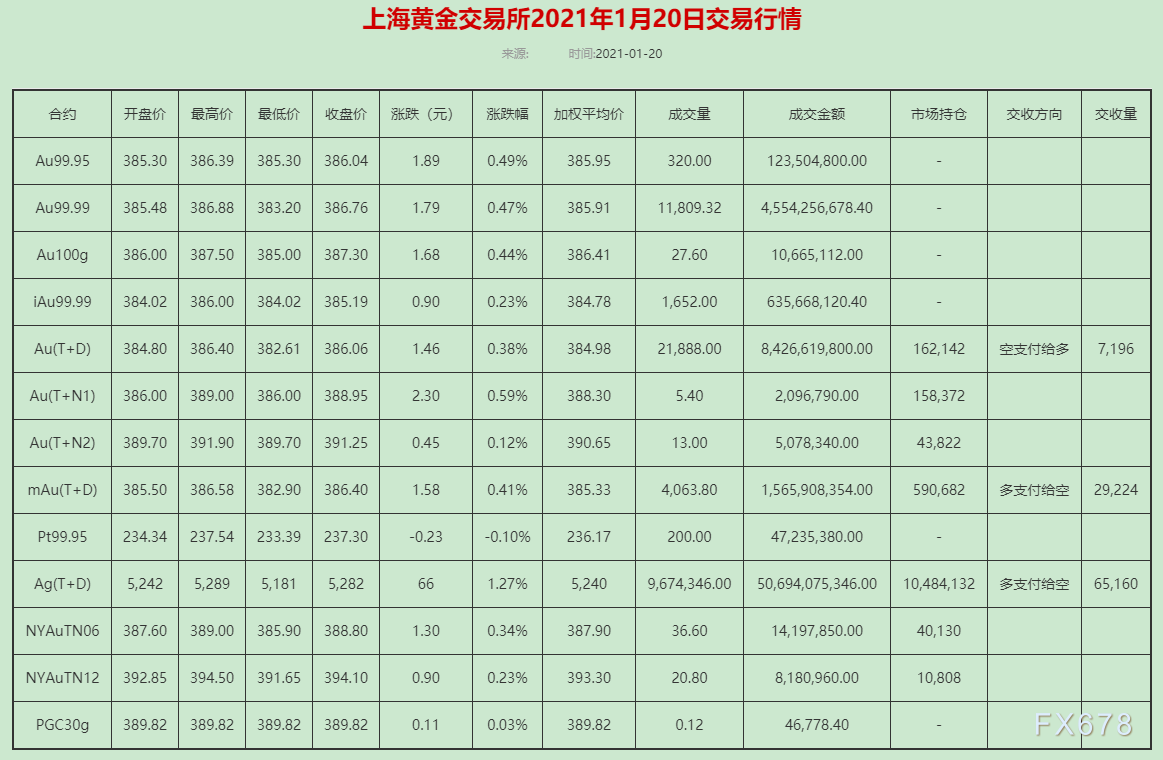 ① 黄金T+D收盘上涨0.38%至386.06元/克,成交量21.888吨,成交金额84亿2661万9800元,交收方向“空支付给多”,交收量7.196吨;