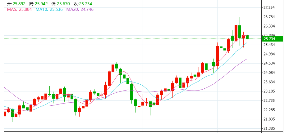 日图持稳MA10反弹,但MA5倾向转为下行,随机指标继续下行,有望对2月低点以来的涨势进行修正。4小时图反弹在26.05一线受阻多空拉锯,空头略胜一筹。小时图反复测试26.00不破重新下行,先看25.45。