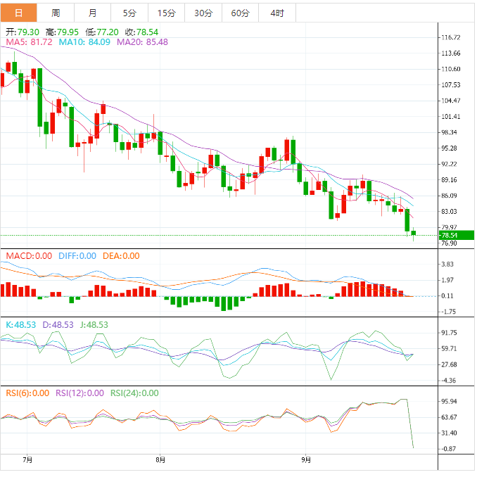 美原油震荡走弱,延续上周五跌势,最低触及77.20美元/桶,为1月6日以来新低,上周五出炉的欧元区、德国、法国、英国的9月份PMI数据表现较差,加剧了市场对全球经济衰退的担忧,而全球多数央行的大幅加息前景依然笼罩市场,全球股市普遍下跌,打压原油需求前景;美元不断冲高,刷新逾20年高点,美国原油钻机数据回升至近两年半高位,暗示美国产量将不断增加,也打压油价。失守80整数关口后,技术面看空信号也有所增强,短线油价面临进一步下跌风险。