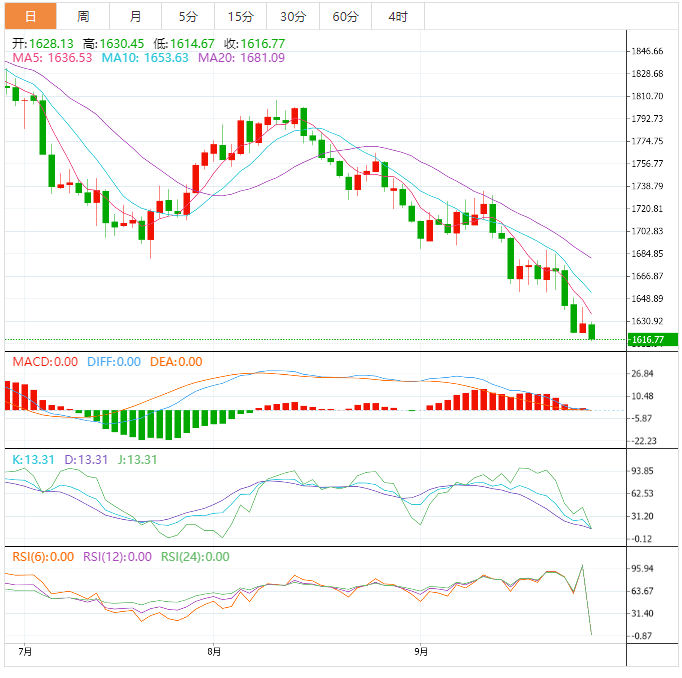 金价在经历了昨天的短暂上涨后,恢复了负增长,目前在1625.00附近波动,等待进一步下跌,向下一个下跌目标点——165.00下跌。