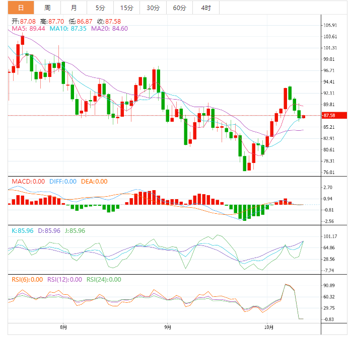美原油在近一周低位徘徊,目前交投于87.05美元/桶附近,市场担忧全球多数央行的进一步加息将加剧经济衰退风险,这打压原油需求前景;OPEC月报和EIA月报也下调原油需求增速预期,API原油库存增幅大于预期,汽油库存意外增加,也打击多头士气,周三油价冲高回落后技术面短线看空信号也有所增加,短线油价面临进一步下行风险。