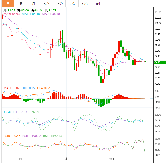 美原油震荡微跌,目前交投于84.66美元/桶附近,API原油意外大幅增加,对油价产生拖累,但沙特能源部长抨击美国释放战略储备的行为,市场对美联储将放缓加息步伐的预期升温,美元跌至近三周低位,也给油价提供支撑,油价暂时维持震荡走势。