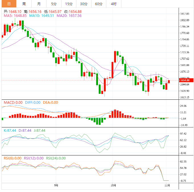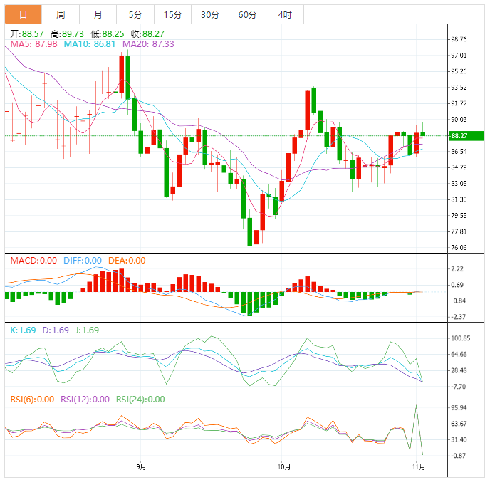 美原油震荡上涨,逼近90关口附近的近三周高位,目前交投于89.40美元/桶附近,花旗等投行上调油价预期,API原油库存意外大幅下降,市场传闻亚洲大国讨论明年放缓防疫措施,改善了需求前景预期,给油价提供支撑。技术面看涨信号有所增加,油价有望向上突破近期的震荡区间。