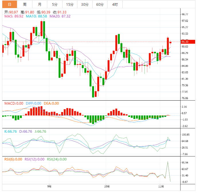 美原油低开后震荡运行,目前交投于91.25美元/桶,一方面市场担忧亚洲大国的防疫政策打压原油需求前景,而且美国原油钻井数据持续增加,也略微利空油价;但另一方面OPEC+的减产计划,也在中长线支撑油价,而且,亚洲股市延续涨势,美元回落,也在短线给油价提供支撑;基本面整体仍偏向多头。