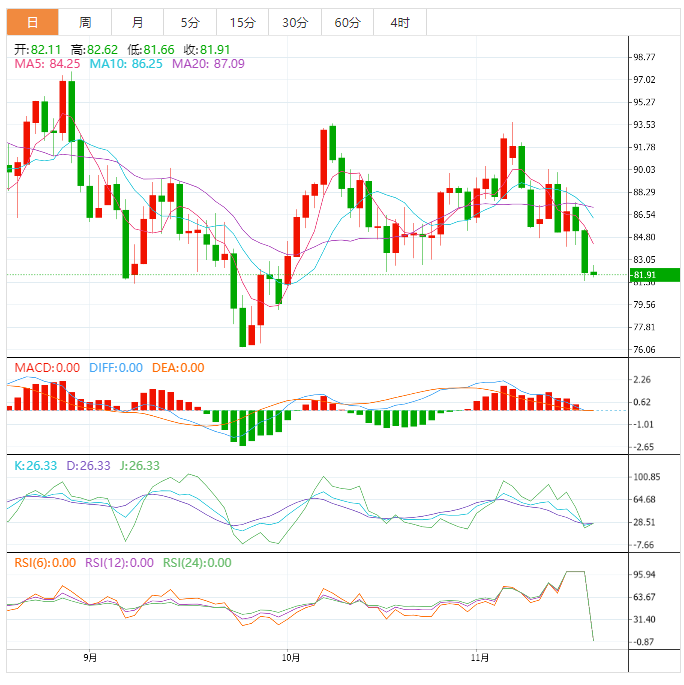 美原油在近一个半月低位徘徊,目前交投于82.22附近,一方面,市场对亚洲疫情的担忧情绪升温,市场担忧疫情会拖累需求前景,另一方面,本周多位美联储官员的鹰派讲话帮助美元企稳反弹,也加剧经济衰退担忧,在地缘局势担忧降温后,油价持续走弱,目前油价正在试探10月18日低点82.06附近支撑,一旦跌破,油价面临加速下跌的风险。