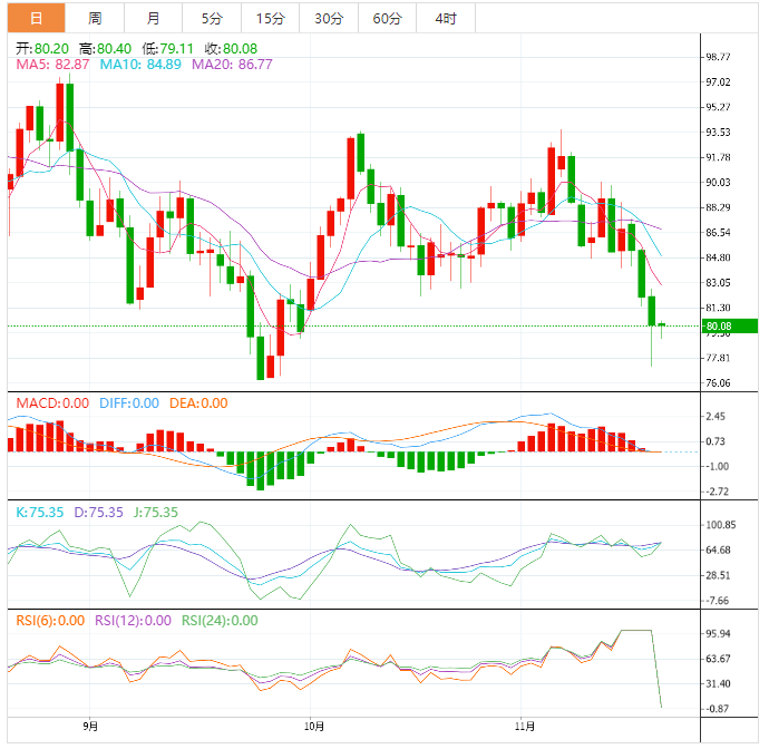 美原油震荡走弱,一度下跌逾1%至79.11美元/桶,美元的反弹令油价承压,而且炼油厂在12月5日欧盟对俄罗斯原油禁运前提高了库存,欧洲原油供应紧张有所缓解;市场对亚洲大国的疫情担忧也打压需要前景;短线来看,油价面临进一步下行风险。