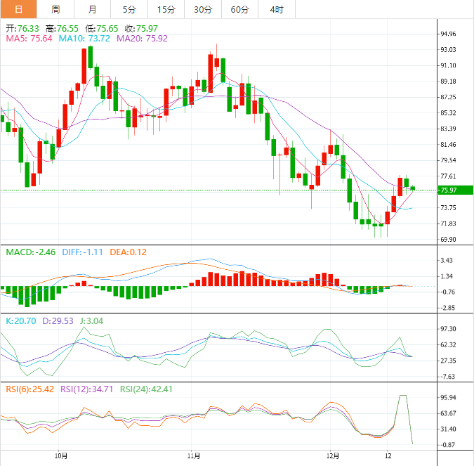 美原油震荡微跌,目前交投于75.98美元/桶,美联储、欧洲央行和英国央行等央行进一步加息,市场对全球经济衰退担忧有所升温,再加上美元周四大幅反弹,油价周四涨势受阻,并展开了回调走势,但中国需求有潜在的上升空间,仍给油价提供支撑,预计后市仍有进一步震荡走高的机会。