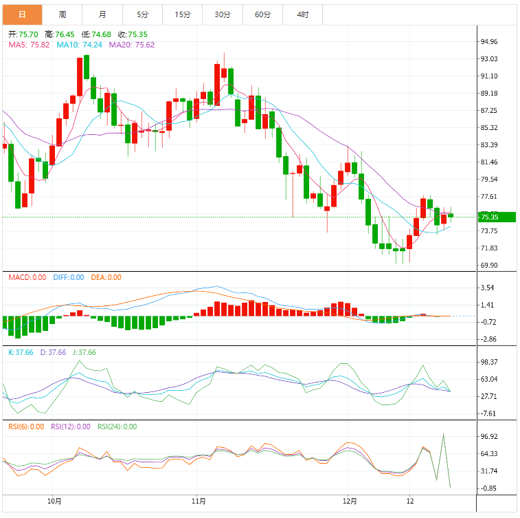 国际油价转跌,受需求前景不确定性影响,尽管美元走软和美国计划补充战略储备给市场提供支撑。NYMEX原油下看73.93美元。尽管如此,石油需求前景将是决定原油价格能否持续走高的关键。若缺乏明显的需求增长迹象,油价很难进一步攀升。全球经济担忧带来的下行压力将普遍存在。联合组织数据倡议组织(JODI)周一(12月19日)公布的数据显示,全球最大石油出口国沙特阿拉伯10月份原油产量从9月份的1104.1万桶/日降至1095.7万桶/日。
