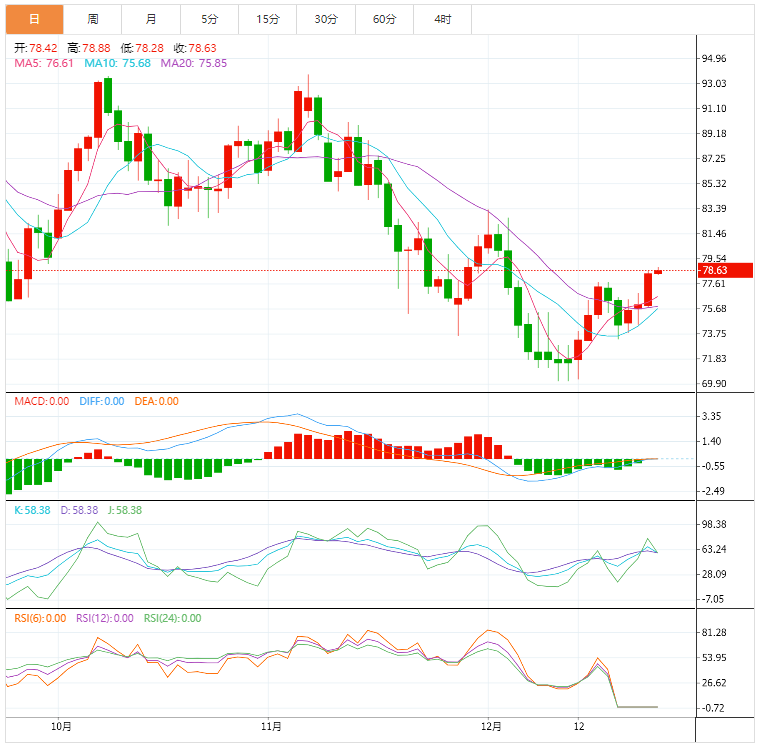 美原油窄幅震荡,目前交投于78.50美元/桶,守住了隔夜大部分涨幅。周三油价上涨逾3%,因美国原油、取暖油和航空燃料库存紧张,与此同时美国遭遇寒流侵袭, 且假日季节出行人数也将激增。