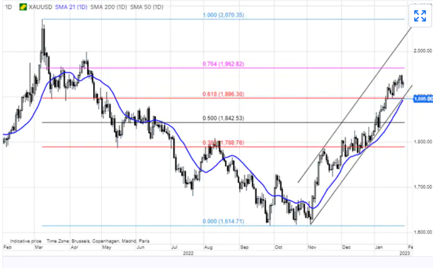 除了本周的高点1950美元和1963美元(2022年修正的76.4%回档位)之外,在重要的心理关口2000美元之前没有主要阻力位,而支撑位在1900美元附近,21日移动均线与11月低点的上升趋势线相遇。