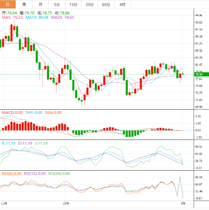 美原油窄幅震荡,目前交投于79.08美元/桶附近,虽然1月份OPEC产量下降,美股大涨,给油价提供支撑,但API原油库存意外大幅增加,为连续第五周大幅增加,汽油库存增幅也大于市场预期,令原油多头有所顾忌。