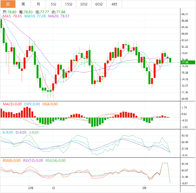 今天的预期交易区间在77.40支撑位和80.50阻力位之间。
