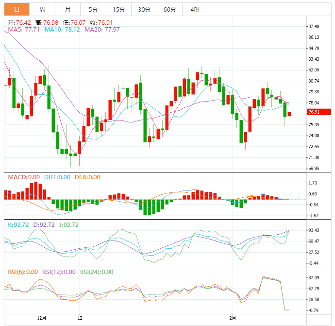 美原油震荡反弹,目前交投于76.84美元/桶附近,亚洲股市普遍上涨,提升了市场对中国需求复苏持乐观态度,分析师预计,由于运输燃料需求增加以及新炼厂投产,中国的原油进口量将在2023年创下历史新高。高盛在2月19日的报告中称,未来的石油供应短缺可能会推动油价在今年年底达到每桶100美元。