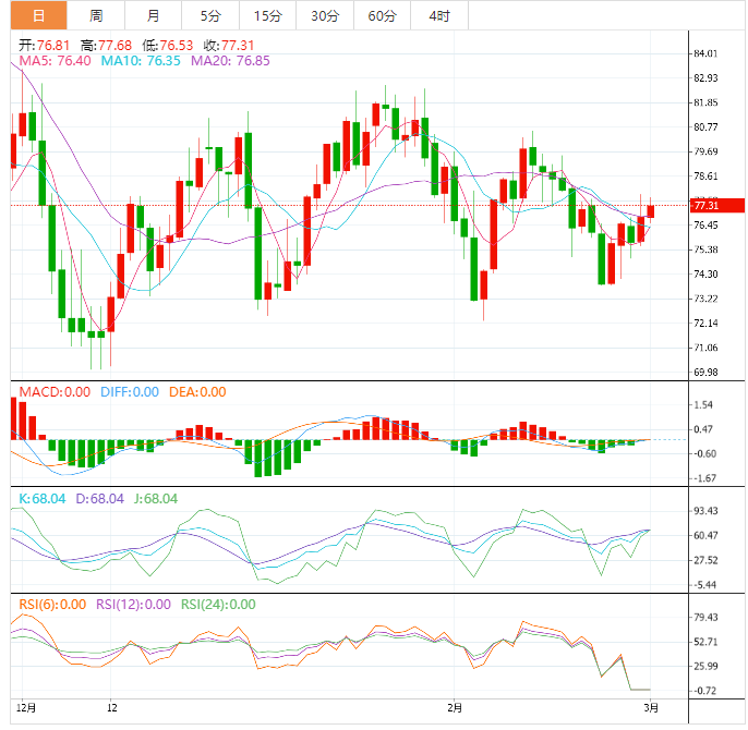 美原油小幅上涨,目前交投于77.53美元/桶附近,数据显示,中国2月份制造业出现了2012年以来的最快扩张,这提振了全球燃料需求前景,避险美元也受到打击。调查显示,随着中国需求的恢复和俄罗斯产量的下降,油价预计将在2023年下半年升至每桶90美元以上。