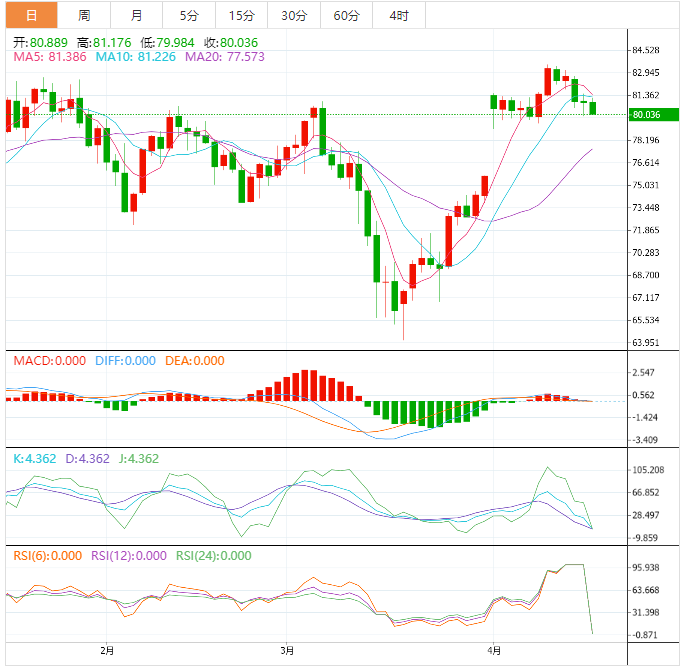 美原油震荡走弱,目前交投于80.26美元/桶,因为市场权衡美联储可能的加息,这可能放缓经济增长并抑制石油消费,抵消了美国API原油库存下降和强劲中国经济数据的提振。基本面来看,油价短线略微偏向空头。技术面来看,短线油价也面临进一步回调风险。本交易日需要关注EIA原油库存系列数据的表现。