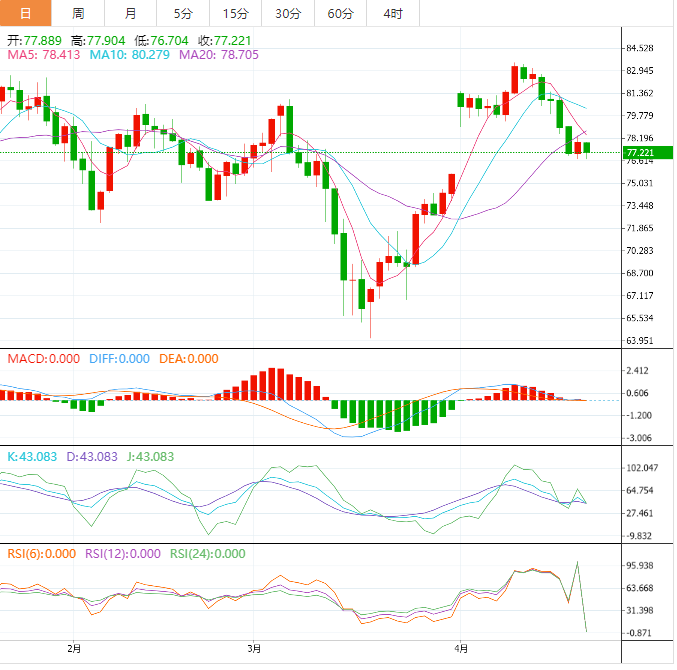 美原油震荡走弱,一度创近三周新低至76.70美元/桶,对利率上升、全球经济和燃料需求前景的担忧,盖过OPEC+减产造成供应紧张前景提供的支持。美国能源公司上周增加了石油和天然气活跃钻机,为四周以来的第一次,也打击多头士气。目前油价再度试探100日均线,短线面临下破该支撑的可能性。