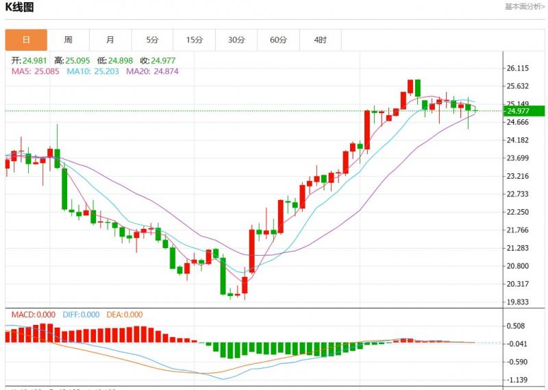 周三欧市盘中,现货白银报24.980,跌幅0.04%。