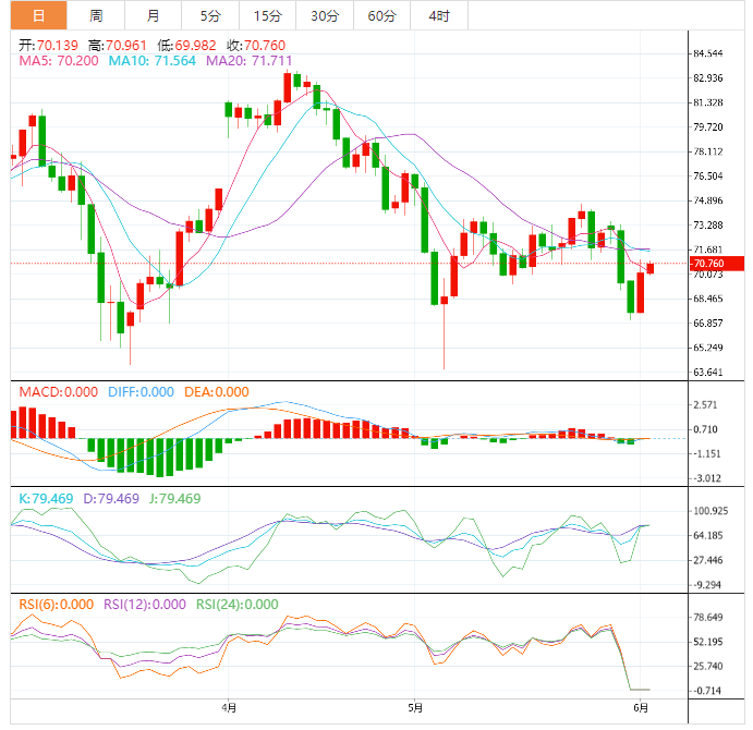 美原油小幅上涨,目前交投于70.83美元/桶附近,美国参议院通过了债务上限议案,基本消除了债务违约风险,提振需求预期,美联储6月份加息预期降温,美元隔夜大跌,也给油价提供支撑,油价隔夜大涨后,短线看涨信号有所增加,短线存在进一步反弹机会。