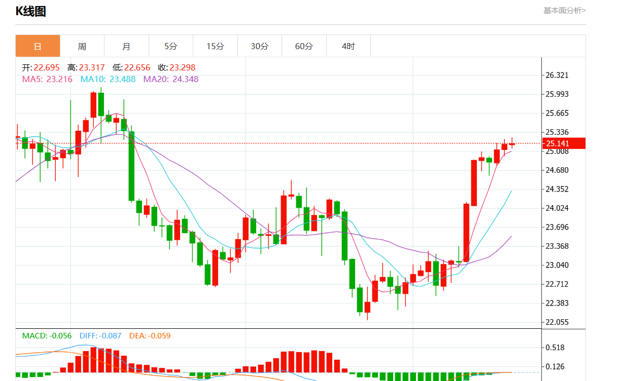 周四欧市盘中,现货白银报25.190,涨跌幅0.24%