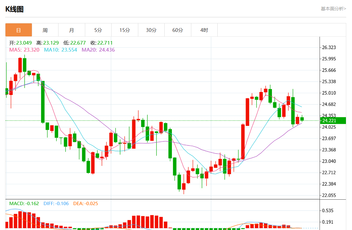 周三欧市盘中,现货白银报24.210,跌幅0.45%。