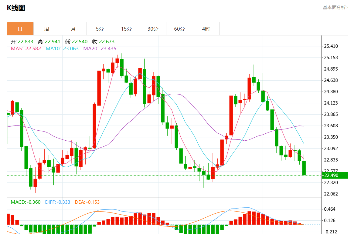 周四欧市盘中,现货白银报22.740,跌幅1.49%。
