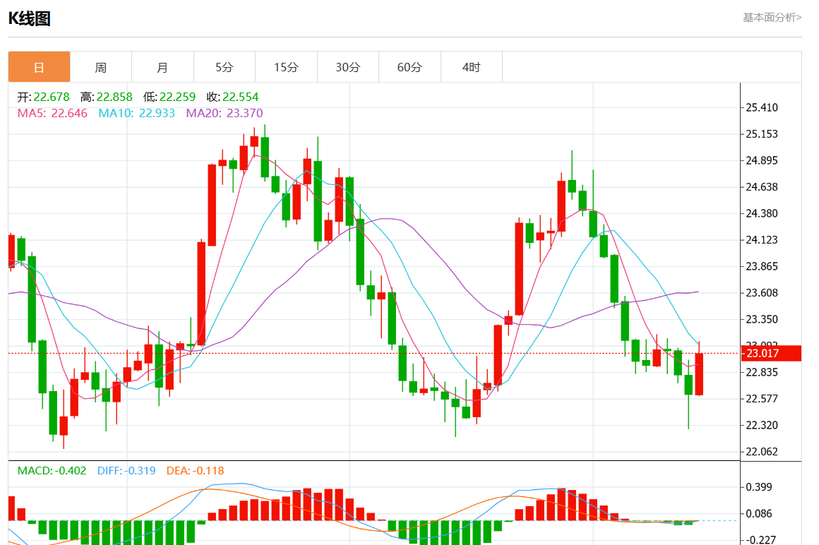 周五欧市盘中,现货白银报23.020,涨幅1.77%。