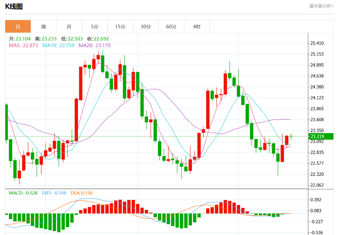 周二欧市盘中,现货白银报23.330,涨幅0.43%。